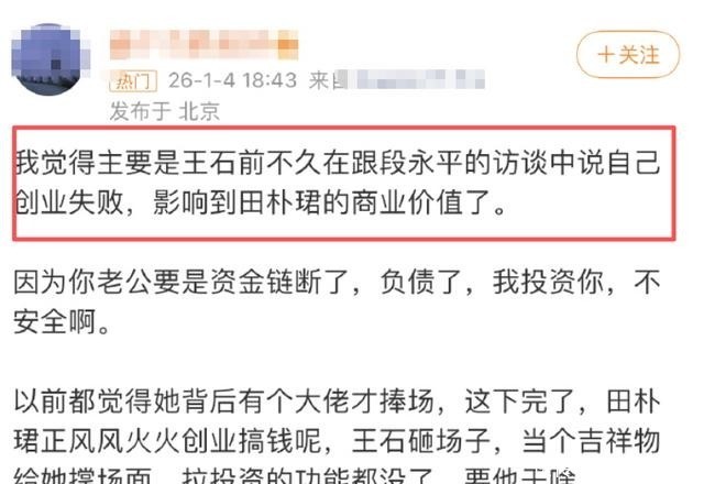 2026年一开年,王石田朴珺就传来婚变。有网友发现田朴珺的酬酢账号照旧删光了和王石的同框照。