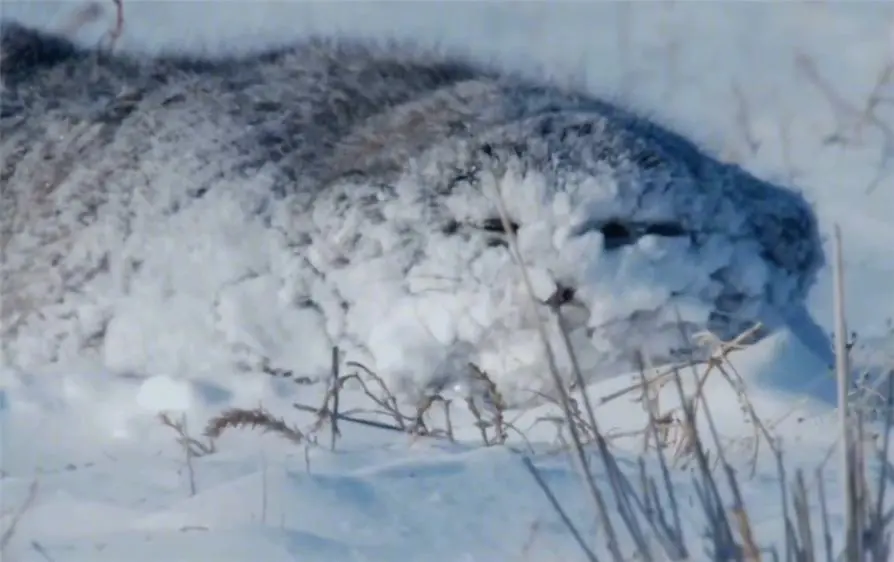 只见前一秒圆滔滔兔狲,下一秒就变成一滩“兔饼”,兔狲将我方的脑袋埋进雪地里,灰白色的外相与周围环境形影相随,淌若不注重看还果真就像一块石头。